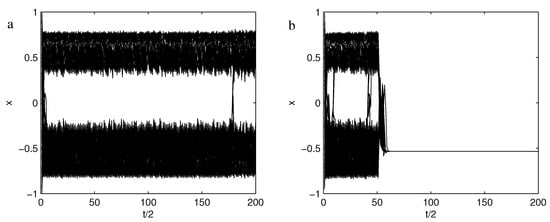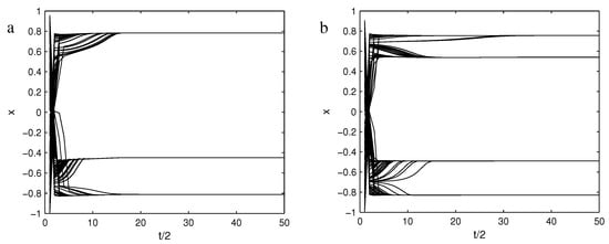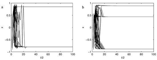 We now review the network’s dynamical behaviors. First, the case of is considered. We chose a network of 100 neurons for our study, and the initial values were randomly selected. Figure 3 and Figure 4 describe the dynamic states of the system (5) under different parameters. When , Figure 3 depicts the 2-cycle and 1-cluster orbit of the network. We set sixty of the initial values as positive and forty as negative in Figure 3a, then the network was stable at the point . Furthermore, changing positive and negative ratios of the initial values to 40:60 in Figure 3b, the network was stable at the point . Moreover, it can be found in the experiment that the network clustering did not change with the change of the initial value in these two cases. However, when positive and negative ratios of the initial value changed and exceeded the critical ratio of 45:65, the network jumped from the 1-cluster state to the 2-cluster state. When changed slightly, the network still remained in the 2-cycle and 1-cluster state with only the cluster point changing. Otherwise, the network jumped out of this state and entered the multi-period and multi-cluster state.