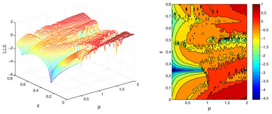 It can be drawn from the above analysis that parameters determine the network’s dynamic properties. Roughly speaking, with the increase of , the chaotic characteristics of the network are enhanced, and the network finally falls into chaotic orbit after the increase of the running period number and the cluster number. Furthermore, the bonding property of the network is also enhanced, which shows the decrease of the running period number and the cluster number, and the network eventually falls into a 2-period orbit. Figure 6 exhibits the largest Lyapunov exponent (LLE) of the system (5) according to parameters and the corresponding contour diagram. Red regions in contour diagram indicate the system is in a chaotic state, and other regions indicate the system is in a stable state. It can be concluded from these two figures that the system has a very wide periodic domain and chaotic domain.