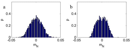 If the positive and negative ratio of the initial value is 1:1, when , the network enters the 2-period 2-cluster orbit. will jump back and forth between two fixed points and according to different initial values. When the bifurcation parameter increases further, the network’s chaotic characteristics enhance, while the coupling characteristics weaken, and transforms from periodic to random gradually. The law remains unchanged now, and it will run on a symmetric orbit in most cases and the neuron’s operating period will gradually increase until the network enters chaos. After the network enters the chaotic state, it is natural to think that as a mean value term is also running in chaotic orbit since every neuron is running in chaotic orbit. However, it is found through experiments that when the network dimension is sufficiently large, the value of represents a certain statistical regularity. Figure 7 shows the density histogram of in the condition of network dimension and , when . It can be seen that the density is approximately a Gaussian distribution; that is, the distribution of approximately obeys the central limit theorem. It can be analyzed that although each neuron runs in chaotic orbit, the proportion of each neuron’s value in the sum is sufficiently small due to the large number of neurons. Moreover, the chaotic characteristics are further weakened after being averaged by the number of neurons, thus, the variation of shows statistical regularity.