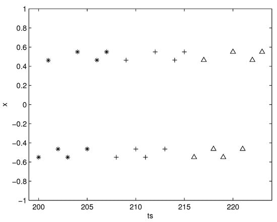 Now, the feedback control of the network with the second delay coupling mode is considered. The delay feedback control is adopted here because the network with this kind of coupling can not be controlled by conventional feedback control. When , the network can be controlled by different 4-period 1-cluster orbits according to different initial values under . The system’s dynamic behavior becomes more complex with the increase of the delay parameters, the network can be controlled stably only when the coherent parameter increases. For example, when , the network can be controlled by the corresponding orbit according to different delay parameters, and the cluster number remains unchanged while the cluster point changes randomly under the influence of the initial value. Figure 9 shows the 8-period orbits of the network with , and the corresponding three clusters are represented by “∗”, “+” and “∆”, respectively. It is worth noting that the value of the delay parameter in the delay feedback control should be consistent with that in the system, otherwise the control system cannot be stabilized, and the parameter domain of the network stability control decreases with the increase of the delay.