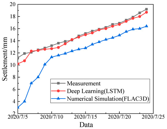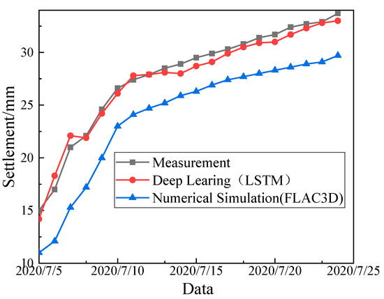 - The LSTM algorithm was used to analyze the temporal characteristics of monitoring data. We found that the MAE and RMSE values of the prediction model were small, and the values of R2 were all greater than 90%, indicating that the model achieved good results on the training and test sets. The results show that the prediction curve based on the deep learning model had a higher similarity to the monitoring curve compared to the numerical analysis. The MIC-LSTM machine algorithm provides a new idea for the deformation prediction of the tunnels.