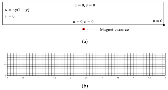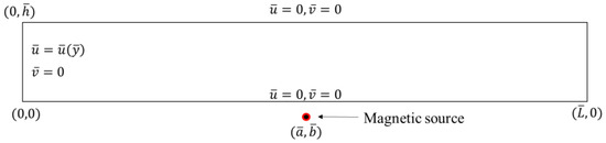 . The entrance velocity was assumed to be fully developed flow, whereas the Neumann boundary condition for the exit velocity was set as zero. A no-slip condition was imposed on the upper and bottom walls of the channel, and a zero-pressure boundary was imposed at the right lower corner of the channel. The magnetic source was located below the bottom wall of the channel, as shown in