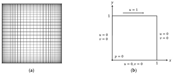 Figure 7a displays the computational domain and boundary conditions. Entrance velocity was assumed to be a fully developed flow, whereas the Neumann boundary condition for the exit velocity was set as zero. A no-slip condition was imposed on the upper and bottom walls of the channel, and a zero-pressure boundary is imposed at the lower right corner of the channel. The mesh for the computational domain is shown in