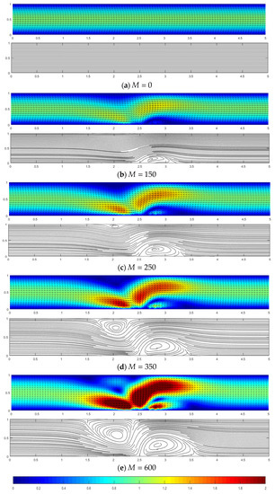 , the height and length of the vortex at both the lower and upper walls of the channel increased with the increment of magnetic number.
