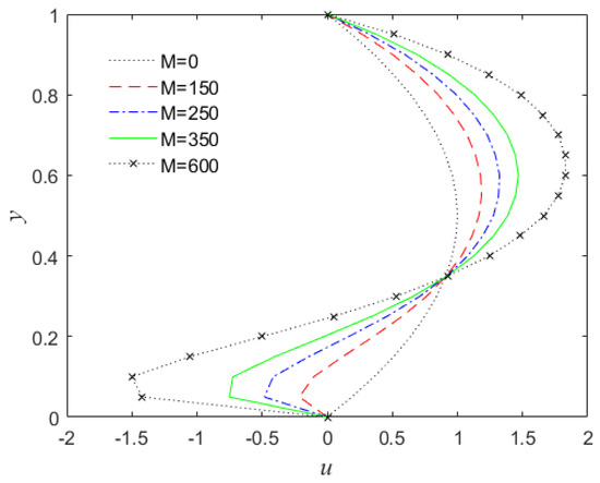 y for different magnetic numbers. The velocity profile changed form when a magnetic field was applied, as can be seen here. Due to the magnetic field action, a vortex formed on the bottom wall. Additionally, when the number of magnetic fields grew, maximal velocity also increased.