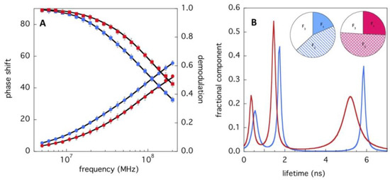 (A) Phase-shift demodulation data of ELAO (6.6 μM, blue symbols) and LSAO (7.0 μM, red symbols), as a function of the excitation frequency. The solid lines correspond to the best fit obtained on the basis of the lowest chi-squared values and residuals; (B) lifetime distributions corresponding to the best fit by interpolating the data of (A). In the inset, the relative fractional contributions of the three species (F1, F2, and F3) are reported.