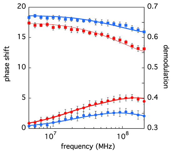 Fluorescence anisotropy phase-shift demodulation data of ELAO (blue symbols) and LSAO (red symbols). The parameters corresponding to the best fits (black curves) are reported in Table 1.