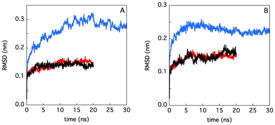 RMSD of the backbone atoms belonging to PSAO (black line), LSAO (red line), and ELAO (blue line), at 25 and 40 °C ((A) and (B), respectively).