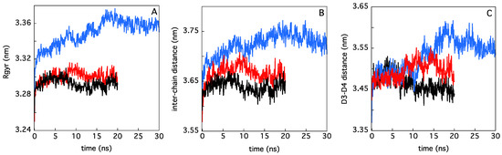 Radius of gyration (A), interchain distance (B), and interdomain (D3–D4) distance (C), of the backbone atoms belonging to PSAO (black line), LSAO (red line), and ELAO (blue line), at T = 25 °C.