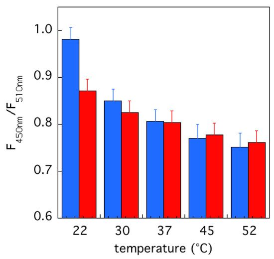 Ratios of ANS fluorescence intensities at two wavelengths (450 and 510 nm) as a function of temperature, in the cases of ELAO (blue bars) and LSAO (red bars). Protein and ANS concentrations were around 1 μM and 10 μM, respectively.