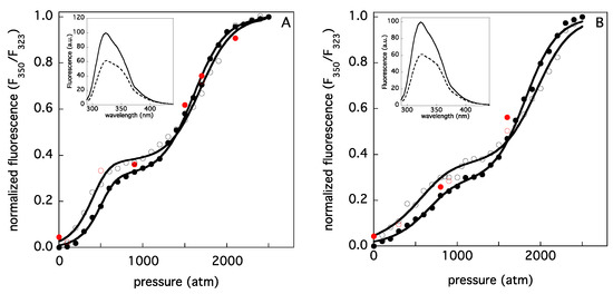 Pressure-induced fluorescence changes of LSAO (A) and ELAO (B), at two different concentrations (namely, 0.8 and 0.7 μM (empty symbols), and 7.0 and 6.6 μM (filled symbols), respectively). The spectral data, which normalized between 0 and 100, were obtained by measuring the ratio of the TRP fluorescence intensity observed at 350 and 323 nm (I350/I323). The red symbols correspond to the values obtained upon depressurization (the open and filled circles correspond, respectively, to low- and high-concentration experiments). The solid lines correspond to the best two-step fitting function, the parameters of which are reported in Table 2. In the two insets, the spectra at 1 and 2500 atm show the effects of high pressure on the shape of the protein spectrum.