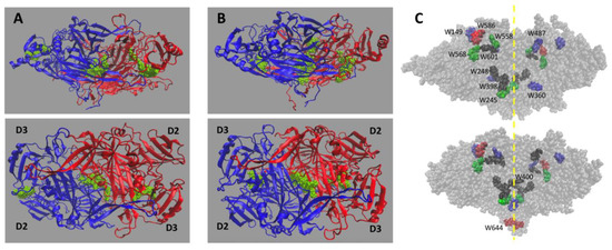 Side and top views: (A) ELAO; and (B) LSAO, of the three main cavity positions (green VDW spheres) found in the simulated structures at the time, t = 20 ns. The external domains, D2 and D3, are indicated in the top views. The grey structures in (C) report the positions of the fully buried (black), mostly buried (80% blue), buried (70%, green), and exposed (red) tryptophan residues, in the case of ELAO (top), and LSAO (bottom). The yellow dashed line indicates the position of the monomer–monomer interface.