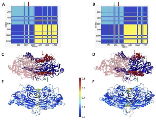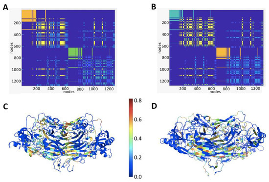 We adopted a protein contact network approach in order to reach a topological characterization of the protein models that were obtained with the MD simulation and a contact network analysis. This methodology is based on a coarse-grained strategy that focuses on the carbon-α distance between the nearest-neighbor amino acids [21], and that disregards the atomic details provided by the crystallographic and simulated protein structures. Since AOs are homodimers, as a first approach, a preliminary analysis in terms of the two clusters was attempted, and the main results of the analysis are reported in Figure 8A,B and in the clustering color map (cfr. Materials and Methods). The two main groups of amino acids, which are well recognizable in cyan and yellow, are almost coincident with the two protein subunits, in both the ELAO and the LSAO. The connectivity pattern is very symmetric for both proteins and is dominated by two relevant intersections that were observed in the blue quadrants around positions, ≈ 360 and 480 (see, for instance, the green and red arrows). Such “fringes” correspond to the amino acids that lie on the two arms that each subunit protrudes towards its mate (as is illustrated in Figure 8C,D) and that are, in fact, equivalently repeated in the rest of the clustering map (Figure 8A,B).