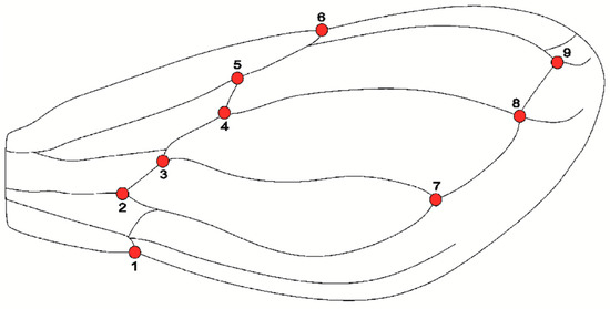 Graphical representation of the wing of T. infestans with nine landmarks at the vein intersections.