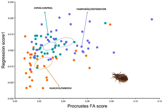 After analyzing the peridomestic populations, FA was found in specimens from Huacaya/Imbochi and Yamparáez/Sotomayor (Ind*side: p < 0.0001) (Table 1 and Table 2). Nevertheless, after a multivariate regression of Shape vs. Procrustes FA Scores intensity was found to be higher in T. infestans from Yamparáez/Sotomayor than specimens from Huacaya/Imbochi (Table 4 and Figure 3).
