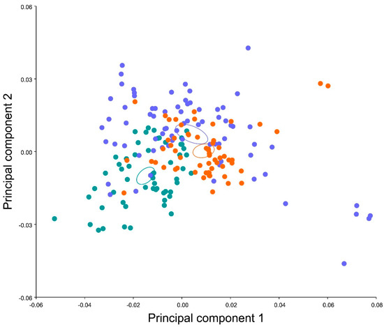 Principal component analysis of the wing shape between three populations in T. infestans. Colors: Green: CIPEIN-Control, Orange: Huacaya/Imbochi, Blue: Yamparáez/Sotomayor.