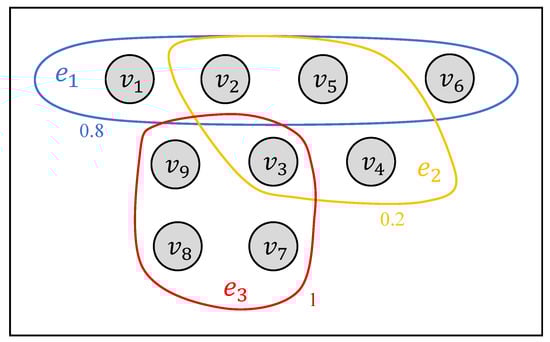 The 4-uniform weighted undirected hypergraph in Figure 1 consists of nine vertices and three 4-cardinality hyperedges with weights equal to , and 1, respectively. The hyperedge connects four vertices, i.e., , , and .