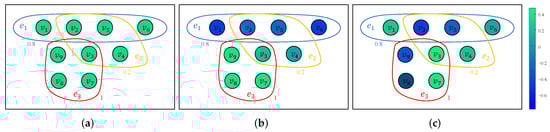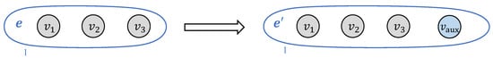 In our work, we consider the weighted undirected hypergraph as a c-uniform hypergraph with a signal where c is an even number. If c is odd, we preprocess all hyperedges by adding an auxiliary vertex to each of them to make their cardinalities even in our previous work []. Specifically, we denote the preprocessed hypergraph by where the weight matrix remains unchanged. Note that each auxiliary vertex only appears in one hyperedge. All auxiliary vertices corresponding to each hyperedge are denoted by for , and the new vertex set contains both original and auxiliary vertices. Each auxiliary vertex is added into the original hyperedge to obtain the new hyperedge represented by . The signal at each auxiliary vertex in the new hyperedge is the arithmetic mean of signals on all vertices in the original hyperedge formulated as . Thus, the preprocessed HGS can be obtained by , in which matrices and are the identity matrix and the incidence matrix of the original hypergraph , respectively. We then can obtain a -uniform hypergraph with even-cardinality hyperedges.