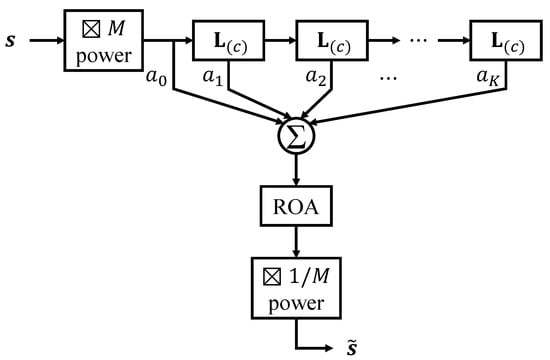 Filtering in either of the two domains takes linear transformations of high-order components as the results. However, the subset is defined to contain all vector forms of the Mth-order -dimension supersymmetric rank-one tensors. Obviously, it is not a subspace and may not contain the column space of . In this case, the subset does not satisfy the rules for vector addition and multiplication by real scalars. Thus, after implementing the linear combination of high-order components, the filtering result may not lie in the subset anymore. It may take an invalid form and not be able to reduce to the original 1st-order form as the filter output. In this case, we need to add the rank-one approximation (ROA) of into the filtering process to obtain a valid high-order signal form. The ROA of the supersymmetric tensor in the least-squares sense [] solves a minimization problem formulated as
