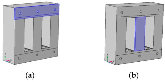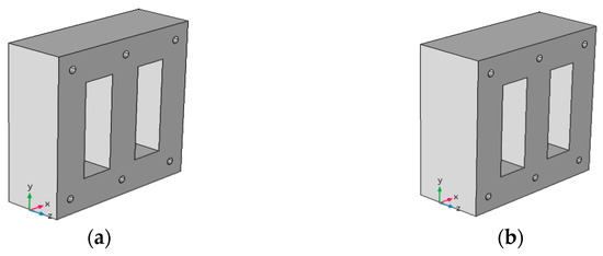 The core looseness fault has no effect on the magnetic field distribution in the transformer, while it can cause notable variations in the structural force field. The core looseness means the larger gap among silicon steel sheets, which can result in a decrease in the Young’s modulus of the core material. In the fault simulation model, the core looseness after a certain period of operation can be simulated by changing the Young’s modulus of the core material in the structural force field analysis. After loosening, the thickness of the core along the lamination direction increases. Therefore, the looseness can be simulated by stretching the geometric model along the lamination direction. The geometric model of looseness fault is shown in Figure 2. The changes in the mechanical parameters of the iron core in the structural force field, after looseness occurs, are shown in Table 1. The mechanical parameter variation caused by core loosening can be measured in the experimental model.