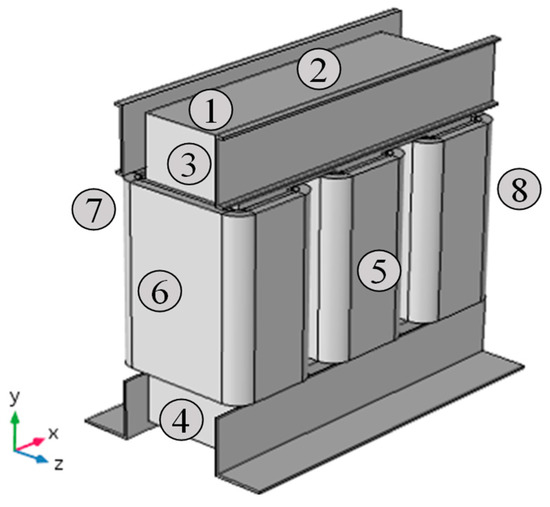 where Lp is the sound pressure level in decibel (dB); p is the sound pressure in Pa; p0 is the reference sound pressure, with a magnitude of 2 × 10−5 Pa. The simulation model adopted to analyze the vibroacoustic characteristics of the model transformer, using COMSOL5.3 Multiphysics software, is developed in the following sections.