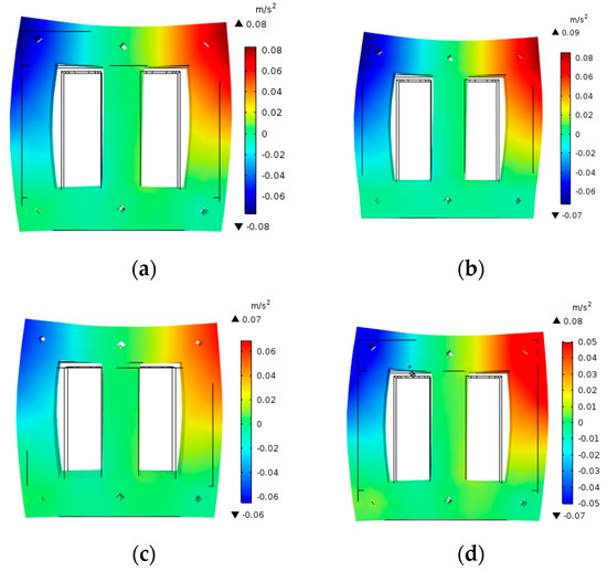 The test equipment is installed based on the test point position in Figure 10b. The acceleration sensors are installed on positions #1 and #2, to measure the acceleration component, in the y direction, of the core. Positions #3 and #4 are the upper and lower points, respectively, on the side surface of the core. Similarly, the acceleration sensors are installed to measure the x-component of acceleration. A rubber pad is laid at the bottom of the transformer to weaken the influence of ground reflection on the acoustic vibration test results.