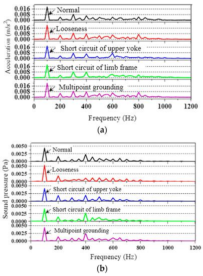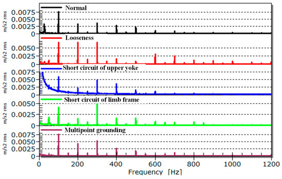 Figure 12 shows the spectrum characteristics of vibration acceleration under different operating conditions at measured point #1. After the transformer looseness fault occurs, the amplitudes of the acceleration spectrum at 200 Hz and 300 Hz begin to increase, and the signals of high frequency, including 600 Hz and 700 Hz, appear. When the interlamination short-circuit fault occurs, although the amplitude of vibration acceleration still appears as whole hundreds Hz, the amplitudes of the acoustic vibration signals at 100 Hz, under the interlamination short-circuit faults, at the upper yoke and limb frame, are decreased. This is because the interlamination short circuit results in an increase in the eddy current in the core. The induced magnetic flux weakens the main magnetic flux. The deformation of the transformer core and the Lorentz force, generated by the increased eddy current, leads to an improvement in the acceleration amplitude at high frequencies, such as 200 Hz, 300 Hz, and 400 Hz. After the occurrence of the multipoint grounding fault, the amplitude at 200 Hz increases, the amplitude at 400 Hz decreases, and the amplitudes at other frequencies are basically unchanged. With the change in core acceleration, the noise around the transformer also changes.