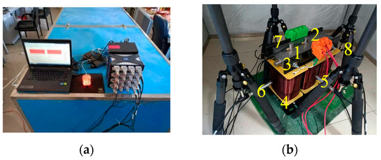 To verify the transformer core fault simulation method proposed in this paper, an acoustic vibration test system is built to measure the vibroacoustic characteristics of the transformer. The established vibroacoustic test system is shown in Figure 10a. The acquisition system consists of four Quantum MX410B modules, each module contains four channels, so there is a total of 16 channels. The vibration signal of the transformer core is detected by an IEPE piezoelectric acceleration sensor CT1050LC, with a sensitivity of 500 mv/g and a frequency range of 0.2 Hz–1.5 kHz. The acoustic noise signal is collected by four microphones, and the model is B&K4189–A021. By combining this model with CATMAN software, the synchronous acquisition and signal processing of the vibration and noise of the transformer are realized. To eliminate the influence of laboratory background noise on the results, as much as possible, the tested transformer is placed in the acoustic enclosure. Figure 10b is the distribution diagram of measured points for the on-site sound and vibration test, in which the measured points 1–4 are the installation positions of the vibration acceleration sensor, and points 5–8 are the microphone measured points.