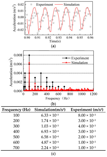 Figure 11 shows that the amplitude of the simulated vibration acceleration is close to the experimental results. The maximum value in the spectrum appears at whole hundreds Hz, such as 100 Hz, 200 Hz, and 300 Hz, where 100 Hz accounts for the main component.