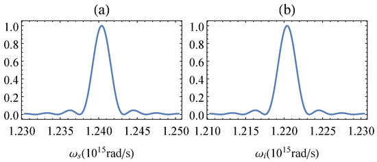 Normalised spectra of (a) signal and (b) idler photons. The FWHM of both is = 2 × rad/s, and the spectral detuning of both is = 10 × rad/s. The following parameters were used for the calculations: L = 8 mm, mm, mm, = 133 m, pump wavelength = 766 nm, ; see the discussion around Equation (12) for more details.