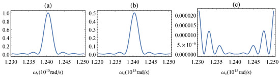 Normalised spectra of signal photons at (a) , (b) , and (c) . The normalisation is performed with respect to the maximum intensity in the constructive interference case, when . The following parameters were chosen and fixed for all further calculations: = 766 nm, L = 8 mm, mm, mm, = 133 m. The choice of rad/s ensures the fully spectral distinguishability of signal and idler photons.