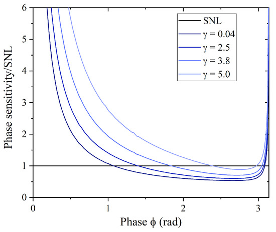Figure 4 shows the trend of the phase sensitivity calculated with respect to the signal photons and normalised to the shot noise limit (SNL) when varying the internal phase of the interferometer. The shot noise limit, which determines the classical phase sensitivity bound, is calculated relative to the number of photons inside the interferometer [13]: