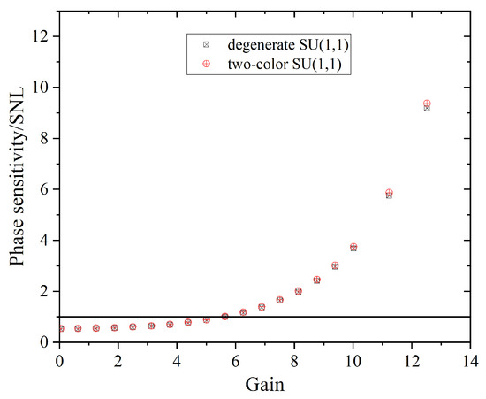 The minimum values of the normalised phase sensitivity presented in Figure 4 versus gain in comparison with the degenerate case reported in [28]. The higher the gain is, the faster the phase sensitivity grows. The SNL is plotted by the black line.