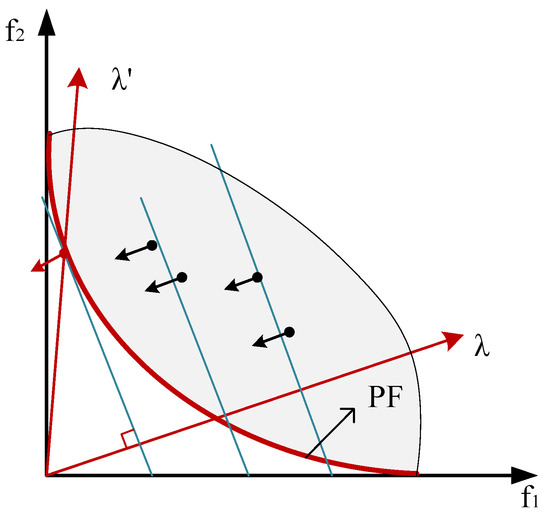 The MODABC algorithm decomposes the multi-objective optimization problem into several single-objective subproblems [16,17]. This approach first generates N uniformly distributed weight vectors and then, constructs N single-objective subproblems using these weight vectors. By solving these N subproblems simultaneously, we obtained the set of non-inferior solutions to the problem to be optimized. Let to be a set of weight vectors and denote the first- and second-dimensional objective functions of the weight vector, the weighted sum approach for the aggregation function (as shown in Figure 2) of the th subproblem is set as follows.