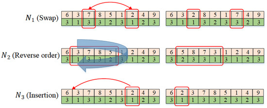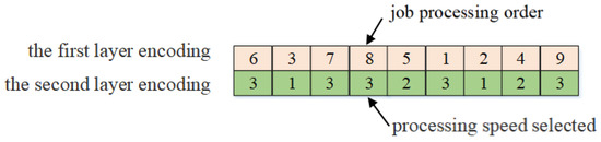 Take the single-machine scheduling including nine jobs with three processing speeds as an example. Figure 3 gives one encoding example for this problem, and the corresponding scheduling scheme is as follows: job 6 is processed at speed 3, job 3 is processed at speed 1, and so on until job 9 is processed at speed 3 at the last time. This discrete two-layer encoding method has three advantages: easy generation of feasible solutions, simple encoding structure and effective reduction of information redundancy compared with random key encoding.