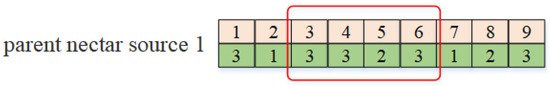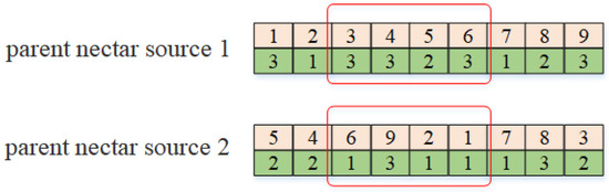 Step 1: The first step is the same as that of PMX, where the starting and ending positions are randomly selected in a pair of parental chromosomes, and the same position is selected for both chromosomes, which is shown in Figure 7.
