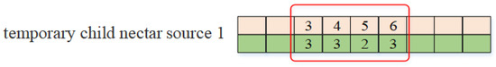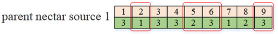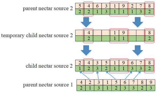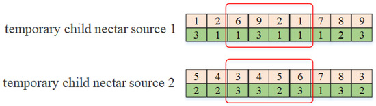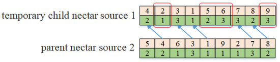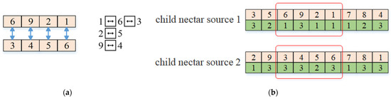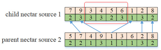 Step 3: Perform conflict detection. A mapping relationship is established using both sets of genes exchanged, as shown in the Figure 6a,b. Take the mapping relationship 1–6–3 as an example, there are two genes 1 in temporary child nectar source 1 in the second step result, which are then transformed them into gene 3 using the mapping relationship until there is no more conflict. In the end, all conflicting genes are mapped to ensure that the new pair of child genes formed is free from conflicts.