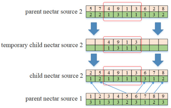 To ensure the feasibility of the solution, we redefined the nectar source update formula. Since the first layer of the encoding uses the permutation encoding and the second layer of the encoding is the result of the processing speed decision of the corresponding job, the job-speed combination at the same position in the first and second layers of the encoding is considered as a whole for the nectar source update transformation. The nectar source update method of the MODABC algorithm consists of three crossovers: partial map crossover, order crossover and position-based crossover. The nectar source update methods are described below.