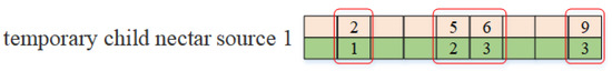 Step 3: First, find the position of the gene selected in the first step in the parent nectar source 2, and then fill in the child nectar source 1 with the remaining genes of the parent nectar source 2 in order, as shown in Figure 9.