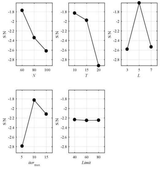 Parameters of the MODABC algorithm includes the number of nectar sources , size of the neighbourhood , number of variational solutions generated by a local search of neighbourhood structure , number of local search iterations and maximum number of scout bee exploitation , making a total of five parameters. The parameter calibration is conducted using the Taguchi method [19,20] in two parts: small-scale and medium-to-large-scale parameter calibration. Here, the Taguchi method is illustrated using the medium-to-large-scale parameter calibration as an example. Taguchi experiments of five parameters and three levels are conducted, and the values of each parameter at different levels are shown in Table 2. The experimental design is performed using Minitab. Table 2 shows 27 groups of the experimental setup.