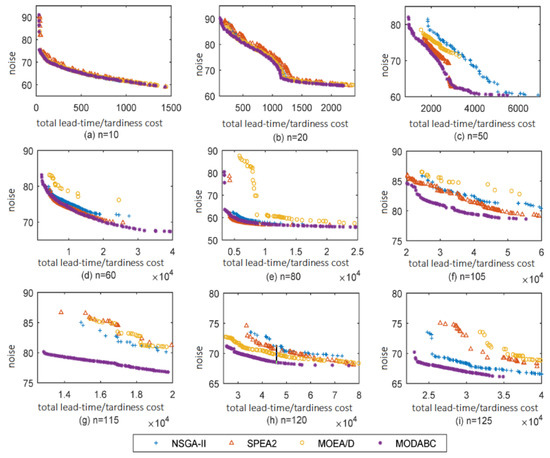The contributions of this paper are summarized as follows: (1) MODABC is proposed with the optimization objectives of simultaneously minimizing lead-time/tardiness cost and job-shop noise pollution emission. (2) A discrete permutation-based two-layer encoding mechanism is designed to generate the initial population using four methods: EDD, SPT, LPT and random generation. Then, three crossover methods, PMX, OX and PBX, are used to perform nectar update operations in the employed bee search phase. Moreover, three neighbourhood structures, swap, reverse order and insertion, are used to improve the onlooker bee search operations. (3) The parameters of the algorithm are calibrated by using the Taguchi method, and the MODABC algorithm is compared with other classical MOEAs to verify its effectiveness in solving the green single-machine multi-objective scheduling problem.