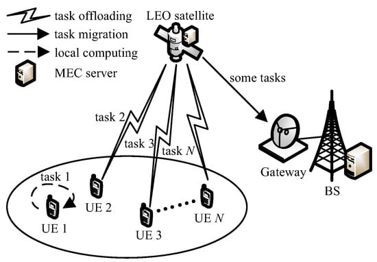 For the areas that are not covered by terrestrial networks, users can rely on satellite networks to obtain services. Comparing with terrestrial networks, LEO satellite networks can provide high-capacity backhaul, large coverage, and more flexible network access services []. In addition, LEO satellite networks have advantages, e.g., low transmission loss and low transmission delay, which can ensure UEs’ quality of service (QoS) []. MEC servers can be deployed at LEO satellites, so users can obtain MEC services by communicating with LEO satellites []. UEs can offload tasks to LEO satellites for computing. Comparing with sending tasks to the remote cloud, the delay is improved significantly [].