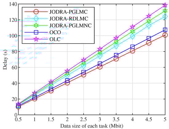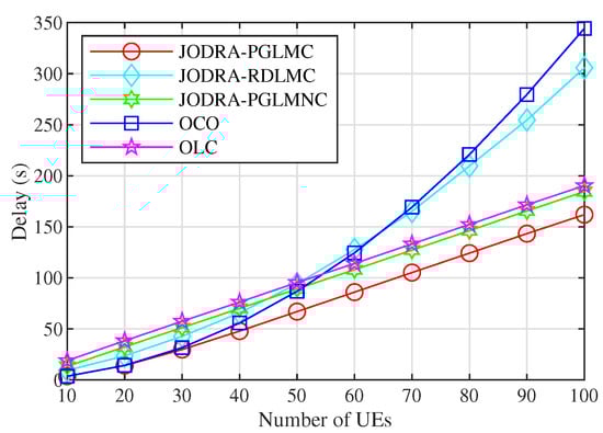 As depicted in Figure 3, as the number of UEs, i.e., N increases, the delay of all schemes increases. The delay of our scheme is always minimal. When , the delay of JODRA-PGLMC and that of OCO are almost the same. When , the gap becomes apparent gradually. It can be seen that there is an intersection for OCO and OLC between and . When , JODRA-PGLMC and OCO are closer. When , JODRA-PGLMC and OLC are closer. This indicates that when N is small, UEs can obtain more computing resources by computation offloading. Therefore, most UEs tend to offload tasks to the LEO satellite or the BS. When N is large, UEs can obtain few computing resources from the LEO satellite or the BS. So UEs tend to compute tasks locally. The delay of JODRA-PGLMC is lower than that of JODRA-RDLMC, and the gap increases gradually, indicating that potential game can obtain a better task offloading decision effectively. The difference between JODRA-PGLMC and JODRA-PGLMNC means the gain brought by the satellite-terrestrial cooperation. The satellite migrates tasks to the BS in an adjacent area can bring stable gain. Comparing with the difference between JODRA-PGLMC and OLC, the difference between JODRA-PGLMNC and OLC is smaller, because computing resources of the LEO satellite’s MEC server are much less than those of the BS’s MEC server. The gain that can be brought by offloading tasks to the LEO satellite is limited. The delay of JODRA-PGLMC is always lower than that of OLC, and they have a relatively stable difference, which demonstrates that no matter offloading tasks to the LEO satellite or the BS can bring gain for UEs, and also confirms the effectiveness of the proposed scheme.