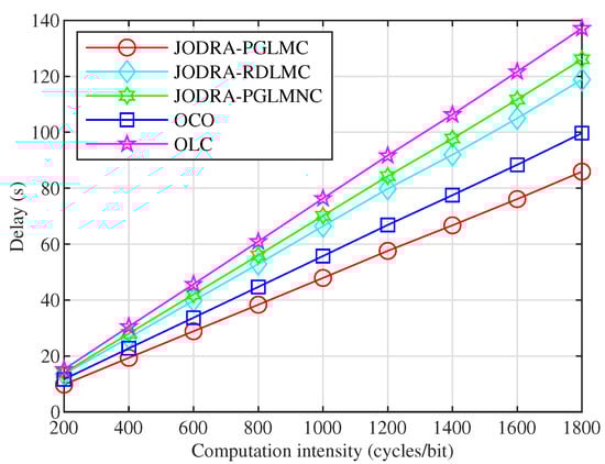 As shown in Figure 4, with the increase of computation intensity, i.e., , the delay of all schemes increases. Because computing resources required by tasks increase, the corresponding task computing delay also increases. The delay of our scheme is lower than that of JODRA-RDLMC, which indicates that the potential game can obtain an appropriate task offloading decision, thus reducing the delay. Comparing with the delay of JODRA-PGLMNC, the delay of JODRA-PGLMC is lower, and the difference between them increases gradually, which means that offloading tasks to the BS can bring higher gain with the increase of , and also illustrates the necessity of satellite-terrestrial cooperation. The delay of JODRA-PGLMC is lower than that of OCO, and they are the closest. The reason is that the more computing resources tasks require, the fewer UEs that the LEO satellite can assist, many tasks are migrated to the BS for computing. The delay of OLC is the highest among all schemes, and the difference between OLC and JODRA-PGLMC is getting bigger and bigger. This proves that both the proper task offloading decision and the proper computing resource allocation are very important and can bring significant gain for UEs.