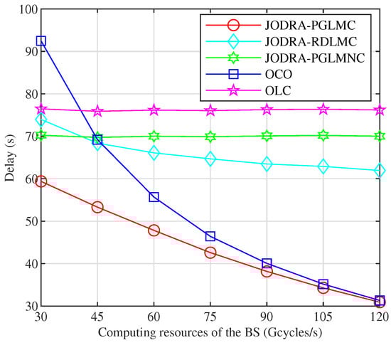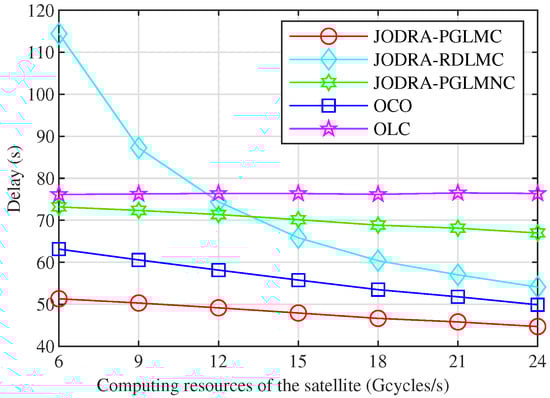 As shown in Figure 6, with the increase of computing resources of the satellite, i.e., , the delay of all schemes except OLC presents a decreasing trend. In addition, the delay of JODRA-PGLMC, JODRA-PGLMNC, and OCO decreases slowly, while that of JODRA-RDLMC decreases rapidly. Because the more computing resources the satellite has, the more computing resources can be allocated to UEs’ tasks, which reduces the task computing delay. However, computing resources of the satellite’s MEC server are far less than those of the BS’s MEC server, the gain brought for UEs is limited. Therefore, the number of UEs that offload tasks to the satellite for computing is relatively small. In JODRA-RDLMC, each UE is likely to offload its task to the satellite for computing, i.e., more tasks are computed by the satellite’s MEC server. Therefore, its delay is affected by significantly. However, because the random decision is not optimal, its delay is high, even the highest when Gcycles/s. The delay of JODRA-PGLMC is lower than that of JODRA-RDLMC, indicating that a suitable task offloading decision can be obtained by potential game. Compared with JODRA-PGLMNC’s delay, JODRA-PGLMC’s delay is lower, and the difference between them is relatively stable, which illustrates that satellite-terrestrial cooperation is effective. The delay of OCO is higher than that of JODRA-PGLMC, which means that all UEs offload tasks to the MEC server is not optimal, and also indicates the importance of an appropriate task offloading decision. Because OLC is independent of computation offloading, its delay is not affected by changes of , and remains unchanged basically. The great difference between its delay and JODRA-PGLMC’s delay proves the effectiveness of the proposed scheme.