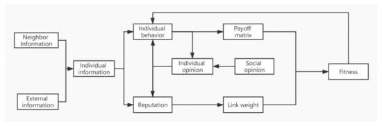 The evolutionary game process on social networks is the cyclic update of individual behavior, reputation, information value, fitness and link weight through the interaction and behavior strategy updates and the mutual coupling of several parts of information infiltration caused by external events.