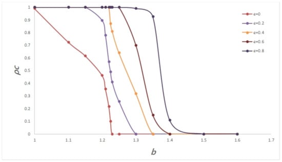 As can be seen from the graph, for example, when , that is, when the evolutionary game of social network degenerates into the PDG, the proportion of cooperators will decrease rapidly with the increase in b, or even disappear eventually, and the threshold of cooperators’ extinction is .