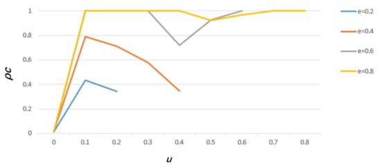 When the change range of u is ensured to meet the requirements, it can be seen that the proportion of cooperative behavior users increases rapidly with the increase in the u value, and the larger the e value is, the earlier it reaches the state of full cooperation. However, with the further increase in the u value, the proportion of cooperative behavior will have a certain amount of attenuation. Therefore, when choosing the value of parameter u, it should reach the critical value of the full cooperation state earlier, that is, .