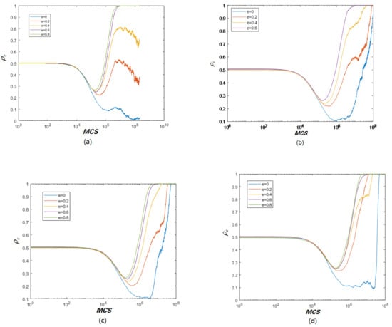 By comparing (a) with (b), (c) and (d) in Figure 5, it can be found that under the same e, the proportion of cooperative behavior in (b), (c) and (d) is larger than that in (a); even the evolution in (b), (c) and (d) can reach the full cooperative steady state faster. Moreover, with the expansion of the link weight range, the proportion of cooperative individuals in the group tends to be completely steady state, which generally conforms to the characteristics of gradual acceleration. This shows that the introduction of information infiltration mechanism is effective.