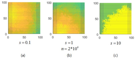 Figure 6a–c shows the diffusion of information in the whole social network when the information penetration rate is 0.1, 1 and 10. The dark cyan to light yellow color shown in the figure indicates an increasing amount of information. It can be seen from Figure 6 that with the increase in the information penetration rate, the amount of information that infiltrates into social networks in a single time increases gradually, but the time interval of information penetration is longer. Before the next new information infiltrates into the group, the amount of information that penetrates into the social network at a single time is very small, and the time interval of information penetration is very short. Therefore, in the process of participating in the game interaction, the game players continuously receive new information, but each time they receive information, it is very limited. So, according to the amount of information they have, they can be divided into many levels, but the boundary between levels is not very obvious. Therefore, based on the above analysis results, it can be found that when the total amount of information is fixed, the faster the information penetration rate is, the more the distribution level of information among individuals in social networks is and the boundaries between different information levels are weaker.